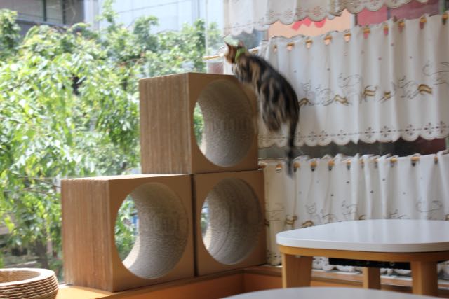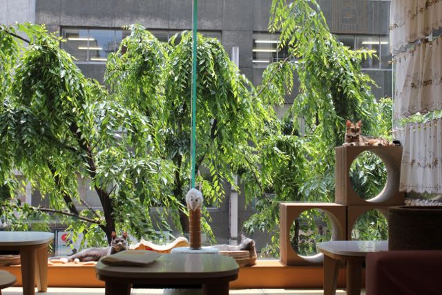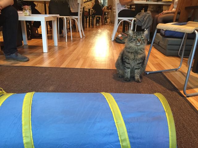 Although it’s clear the main attraction is the cats, things are laid out so that the place looks like a café, with many tables and chairs. The ultimate goal is not necessarily to interact with the cats: you can just sit there sipping your chai and enjoying their presence if that’s what you want to do. Of course, most people get up and make an effort to go towards the cats, which is kind of ironic. If you’re a cat lover, you know that cats would rather come to you, rather than you being a little too enthusiastic and showing interest in them. Of course, it’s hard to resist going after them and showering them with affection: this, I understand firsthand.